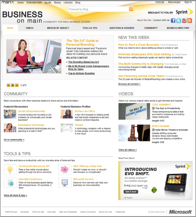 When I first entered the world of online media, it was still unusual for a brand to have a Facebook page or Twitter presence, and social media buttons weren’t a ubiquitous presence on websites. In the case of MSN Business on Main, I saw the site through some major redesigns in response to seismic shifts in the world of Web publishing.